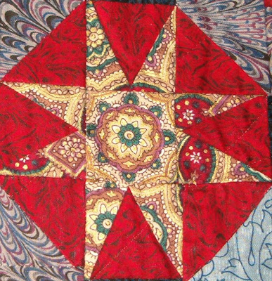 Shopping for fabric is a favorite activity of most quilters. Since most quilts are for bedding that needs frequent washing, cotton fabrics are favored in quilt making. I use cotton even for wall hangings, choosing quality material with a high thread count to ensure durability. After all the time and effort I spend making a quilt, I want my quilts to last. I had no specific fabric in mind when shopping for fabric to create the patterns in the mosaic dome, but hoped to find a color or print that was suggestive of the rich décor of Islamic ornamentation. After visiting several quilt stores I found a Hoffman fabric in red and gold that seemed perfect as a focus fabric for the project.
