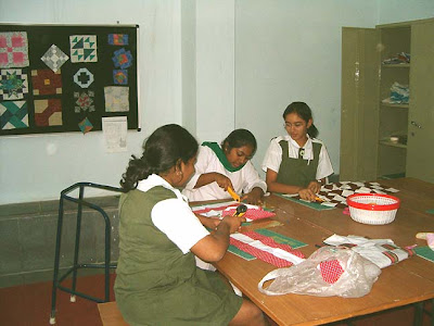 I brought plastic rulers, cutting mats and rotary cutters to India in my luggage. Before my departure from home I debated whether to do so. It seemed reasonable to teach students the easiest, most accurate ways of measuring and cutting fabric. But would it be wise to teach the use of tools unavailable in the Indian market? Hyderabad is a city of seven million so I thought quilting tools might be for sale in the city if I could only find the right shop. A relative spent hours and hours driving me around the city to look for the tools with no success. Fortunately, most of the girls in my class said that they had relatives living the Middle East, England, and United States who could send them quilting supplies on request. I donated the tools I brought from home to the school on my departure.